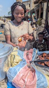 A young woman serving us "red red" (a mixture of baked beans served with fried mashed plantains on the side)