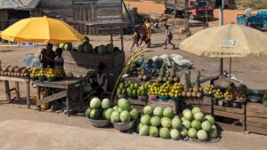 Watermelons, oranges, pineapples, papaya and sugarcane for sale by the roadside