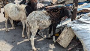Goats tied to a pole in Jamestown