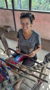 Becky takes a turn at weaving kente cloth