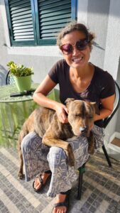 Becky petting a friendly dog at Residencial Melba in Funchal