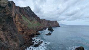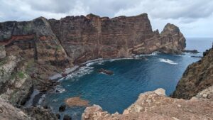 Volcanic layers are visible on the coastal cliffs of the Ponta de São Lourenço trail