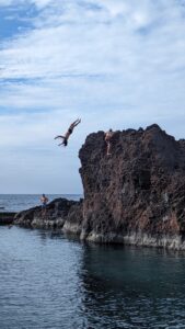 A visitor does a backflip into a salt water pool at Porto Moniz