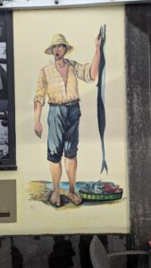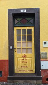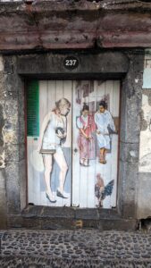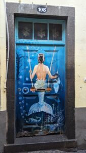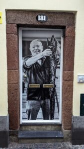 One of over 100 doors on Santa Maria Street that has been painted. This one depicts a black eel like fish known as a "Madeiran Sword Fish" or a scabbard