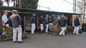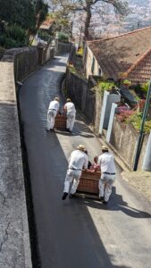 Sledge drivers offer a wicker basket ride down a steep hill from Monte to Funchal