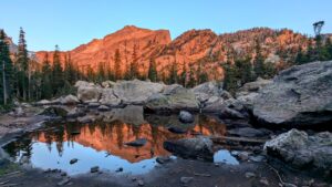 Get up early to snag a coveted parking spot at the trailhead to Bear Lake Road and be rewarded with sunrise; Rocky Mountain National Park