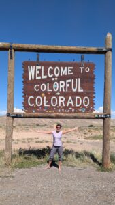 Becky at a "Welcome to Colorado" sign