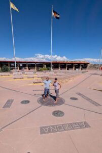 Standing at the Four Corners Monument - the quadripoint where the states of Arizona, Colorado, New Mexico, and Utah meet