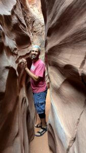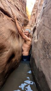 Robby squeezing in a tight crevice at Zebra Slot Canyon