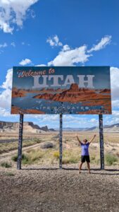 Becky at a "Welcome to Utah" sign