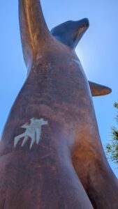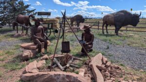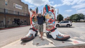 Robby standing between the giant cowboy boots of the legendary Pecos Bill (a fictional cowboy and folk hero who represents the spirit of early settlers in the American West)