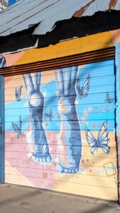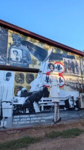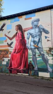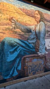 Becky standing next to a massive mural in downtown Flagstaff