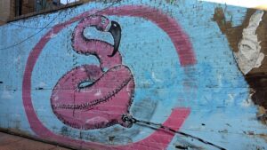 Pink flamingo painted on a wall down a Flagstaff alley