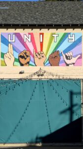 UNITY mural displaying the colors of diversity along with the word UNITY in English and American Sign Language; downtown Flagstaff