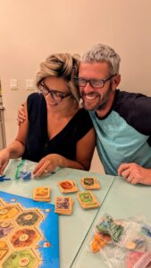 Fran and Robby laughing over a game of Catan