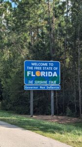 "Welcome to the Free State of Florida" signpost - our USA road trip is quickly coming to an end